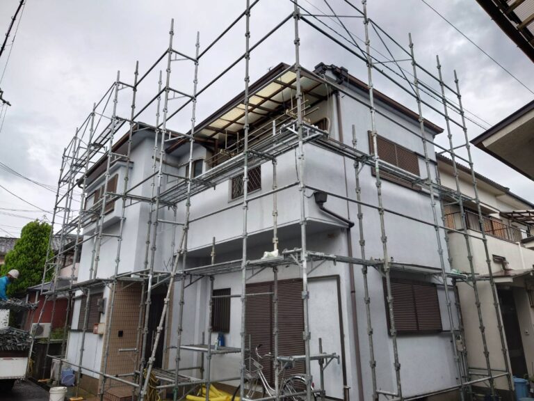 築26年ということもあり、外壁モルタル壁の方はクラックがあり、カラーベスト屋根も現場調査でドローン撮影で経年劣化が見られましたが、現場調査時点で下地の状態をしっかり確認したうえで塗装工事を行いました。小庇や雨戸などの付帯部も含め、全体のバランスを意識して仕上げています。足場組立から外壁塗装工事完了まで、