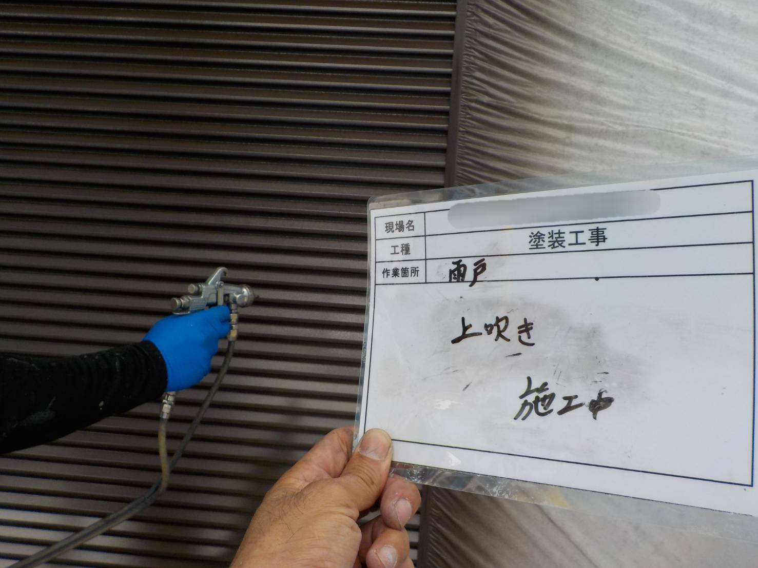 【雨戸戸袋、上吹き】上塗り2回も吹き付けでマックスシールド1500F-JYで上吹き2回目、塗布量・塗り回数・乾燥時間をメーカ指定基準を厳守して施工し耐久性と共に美観も美しく仕上げていきます。