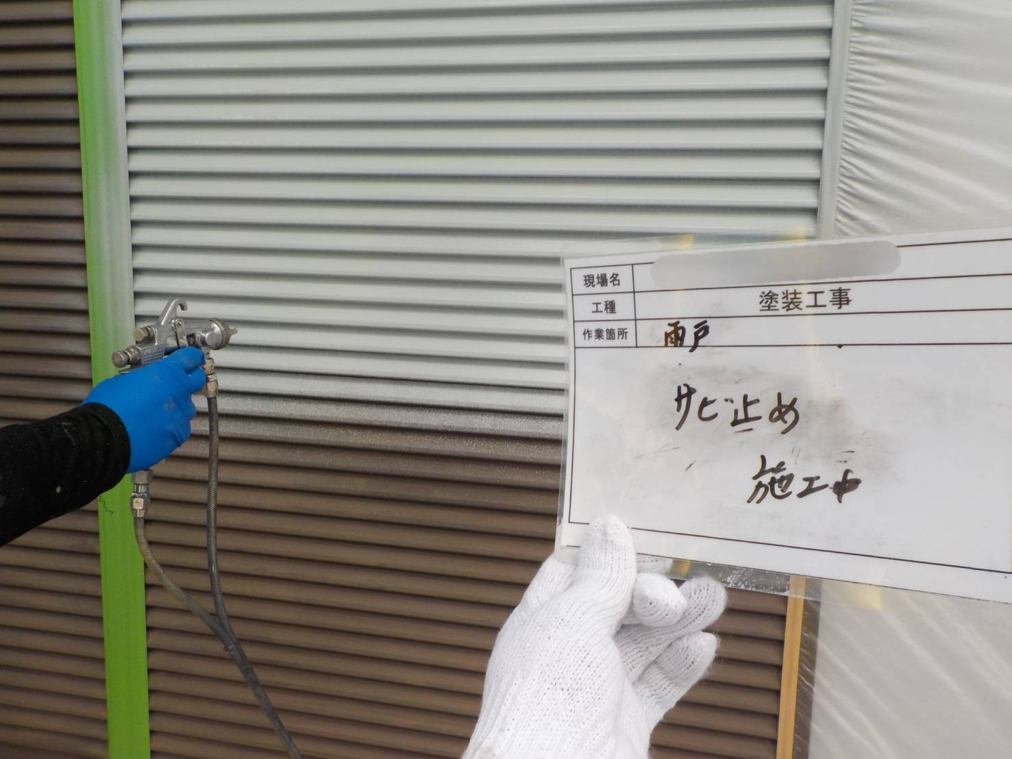 【雨戸戸袋、錆止め】種類や状態に合った錆止め塗料を塗布していきます。下地の吸い込みを止め、調整をかけて、仕上げ塗料材の密着性をよくするための大切な工程です。