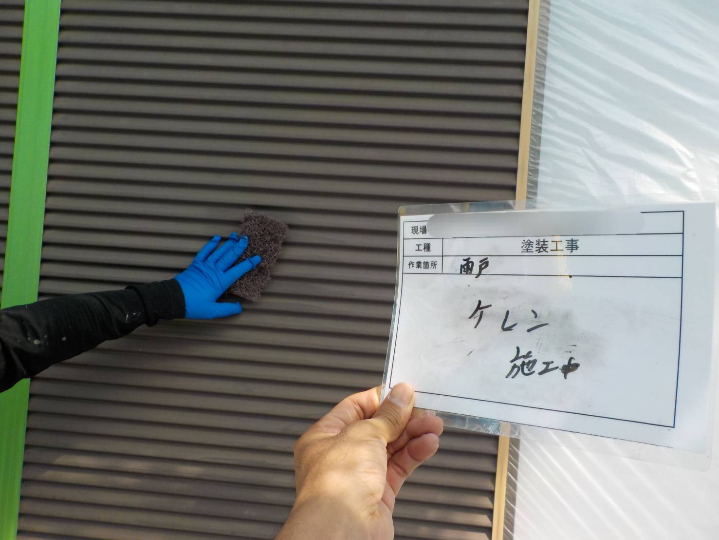 【雨戸戸袋ケレン清掃】ケレン清掃、下地処理の工程です。密着を高める為に重要な作業です。