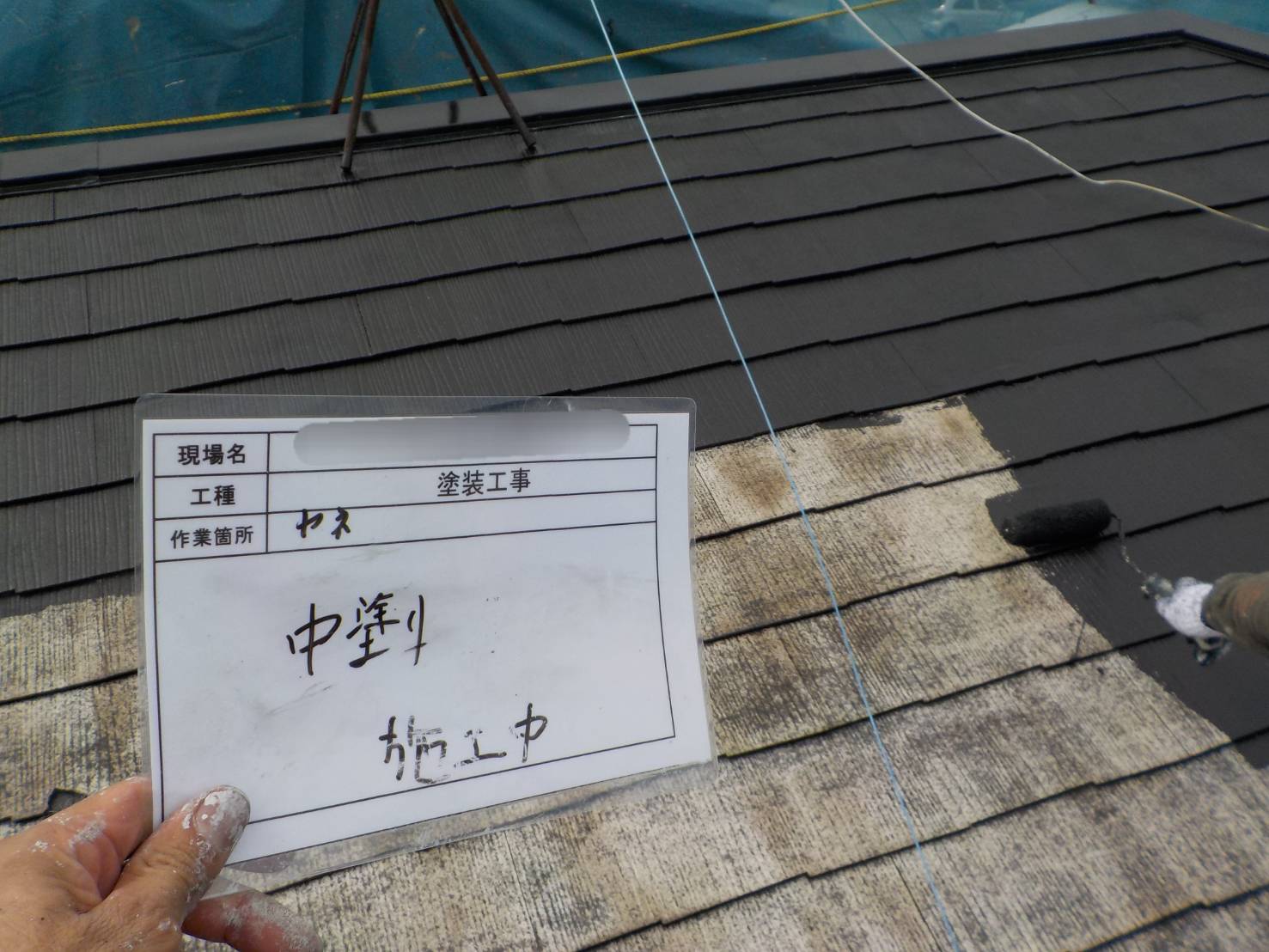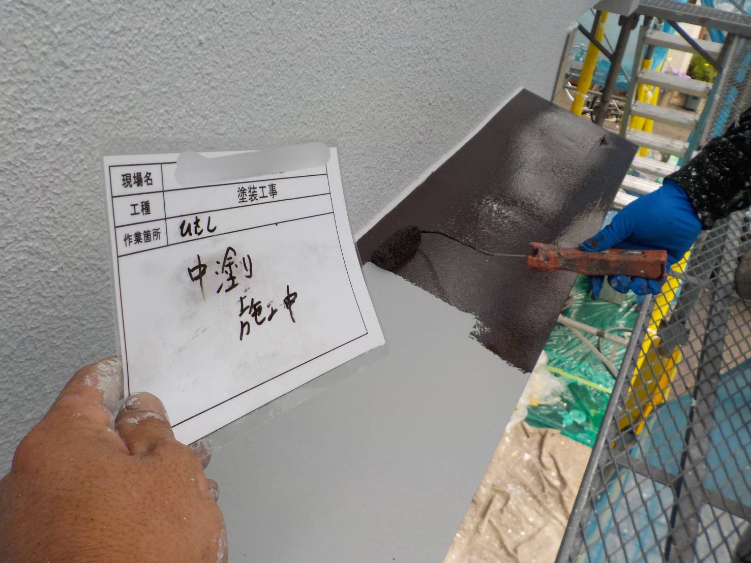 【庇・中塗り】今回はマックスシールド1500F-JY庇・上塗り回目です。塗布量と乾燥時間を厳守して塗っていきます。