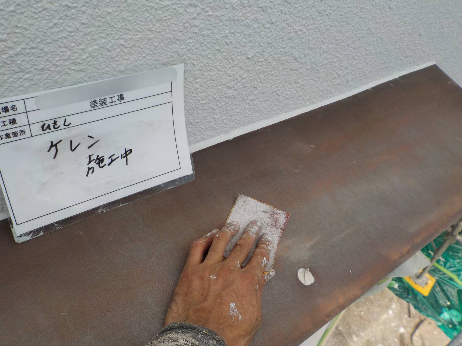 【庇・ケレン清掃】ケレン清掃、下地処理の工程です。密着を高める為に重要な作業です。