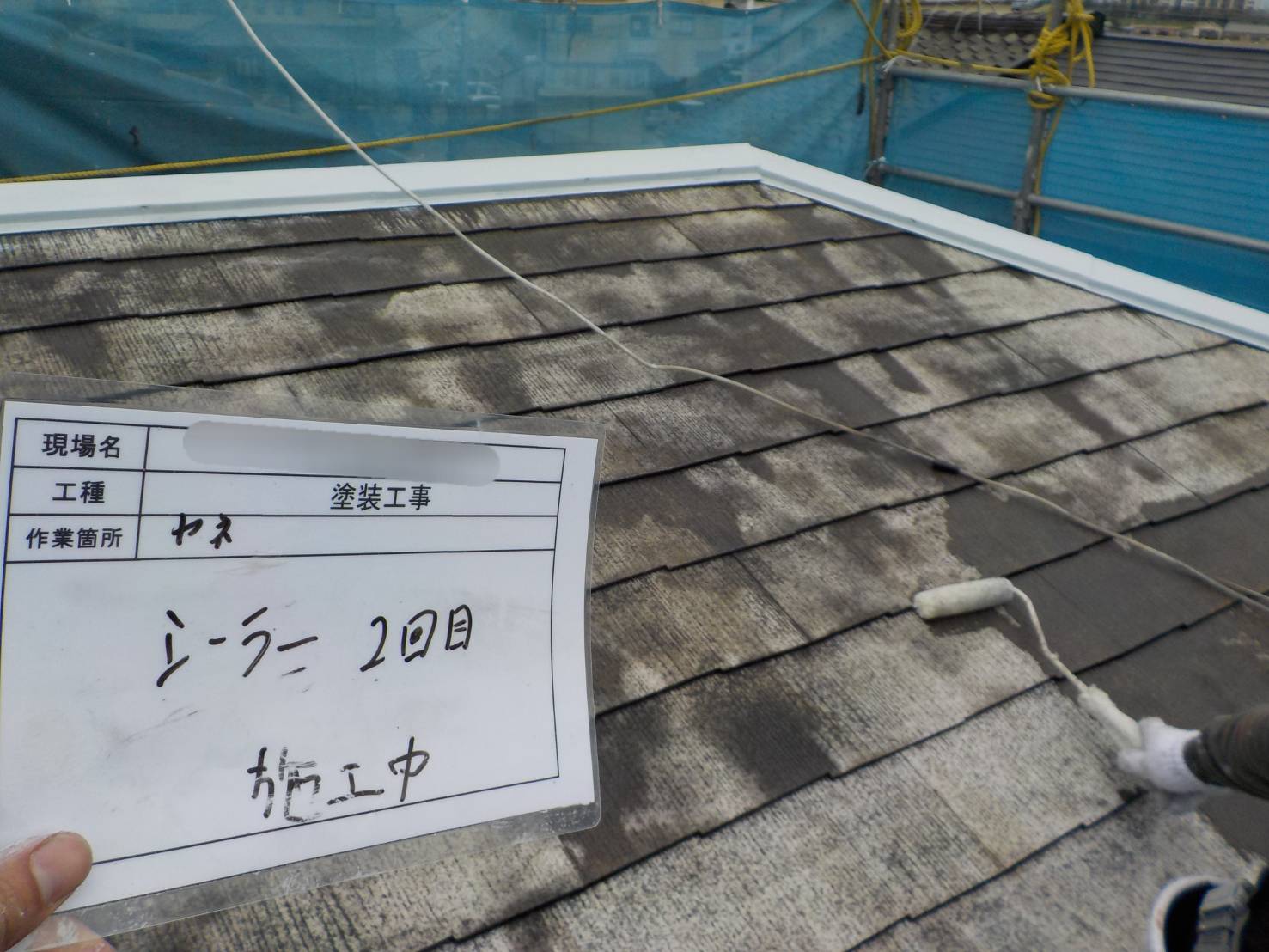【屋根下塗り】屋根の吸込みがある為、エポパワーシーラーJYを2回塗りで密着力を高め塗装を行いました。