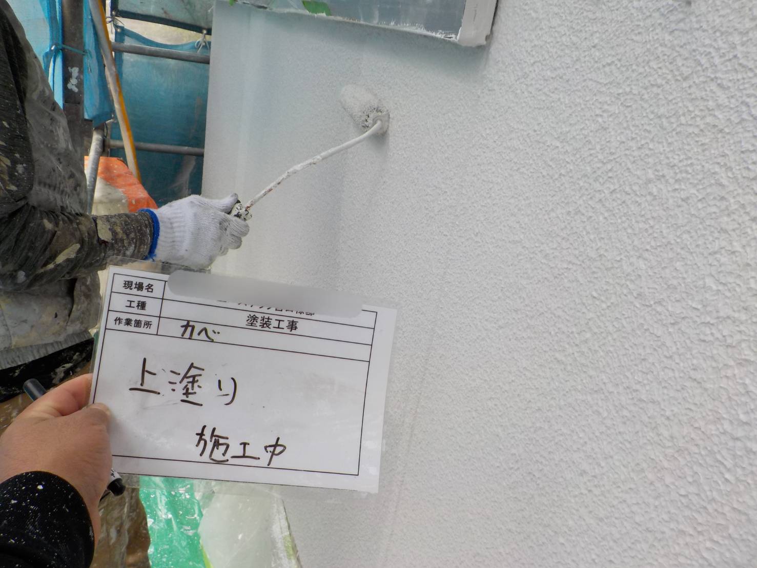 【外壁上塗り】遮熱塗料の、フッ素REVO-IRで上塗り2回目、塗布量・塗り回数・乾燥時間をメーカ指定基準を厳守して施工し耐久性と共に美観も美しく仕上げていきます。
