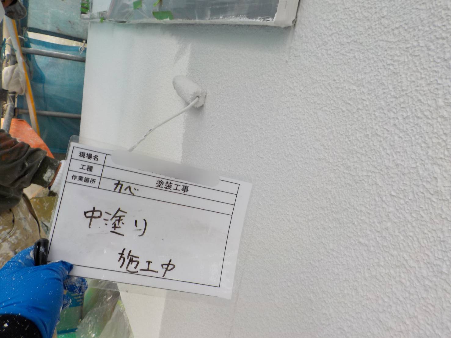 【外壁中塗り】今回は遮熱塗料の、スーパーシャネツサーモFで上塗り1回目です。塗布量と乾燥時間を厳守して塗っていきます