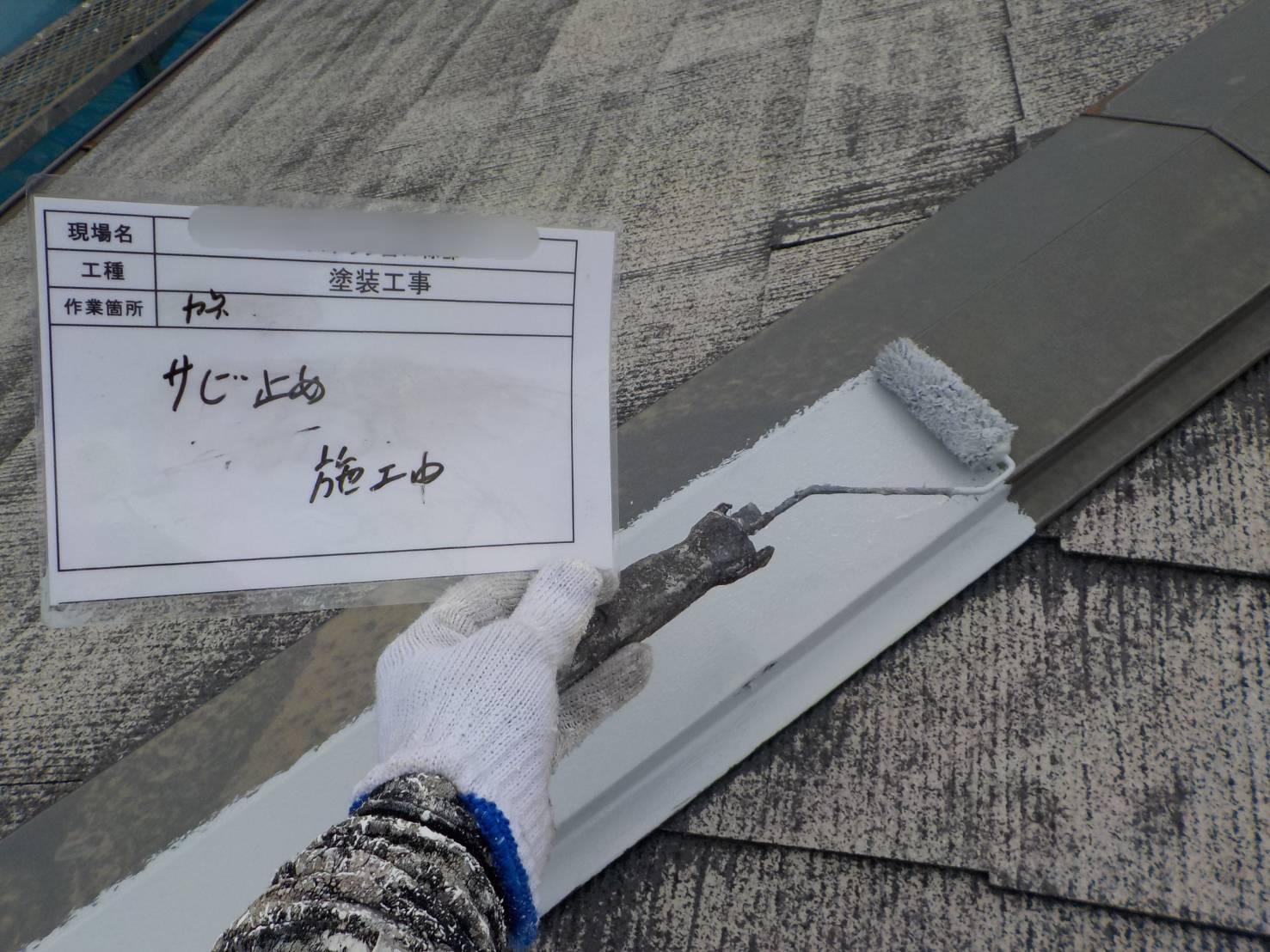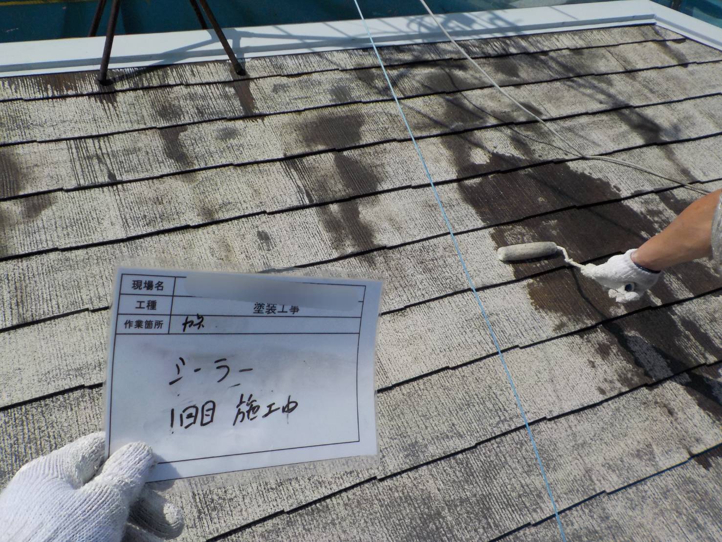 【屋根下塗り】下塗りは、エポパワーシーラーJYで行い、既存屋根材の種類や状態に合った下塗り材を塗布していきます。下地の吸い込みを止め、調整をして、仕上げ塗料材の密着性をよくするための大切な工程です。