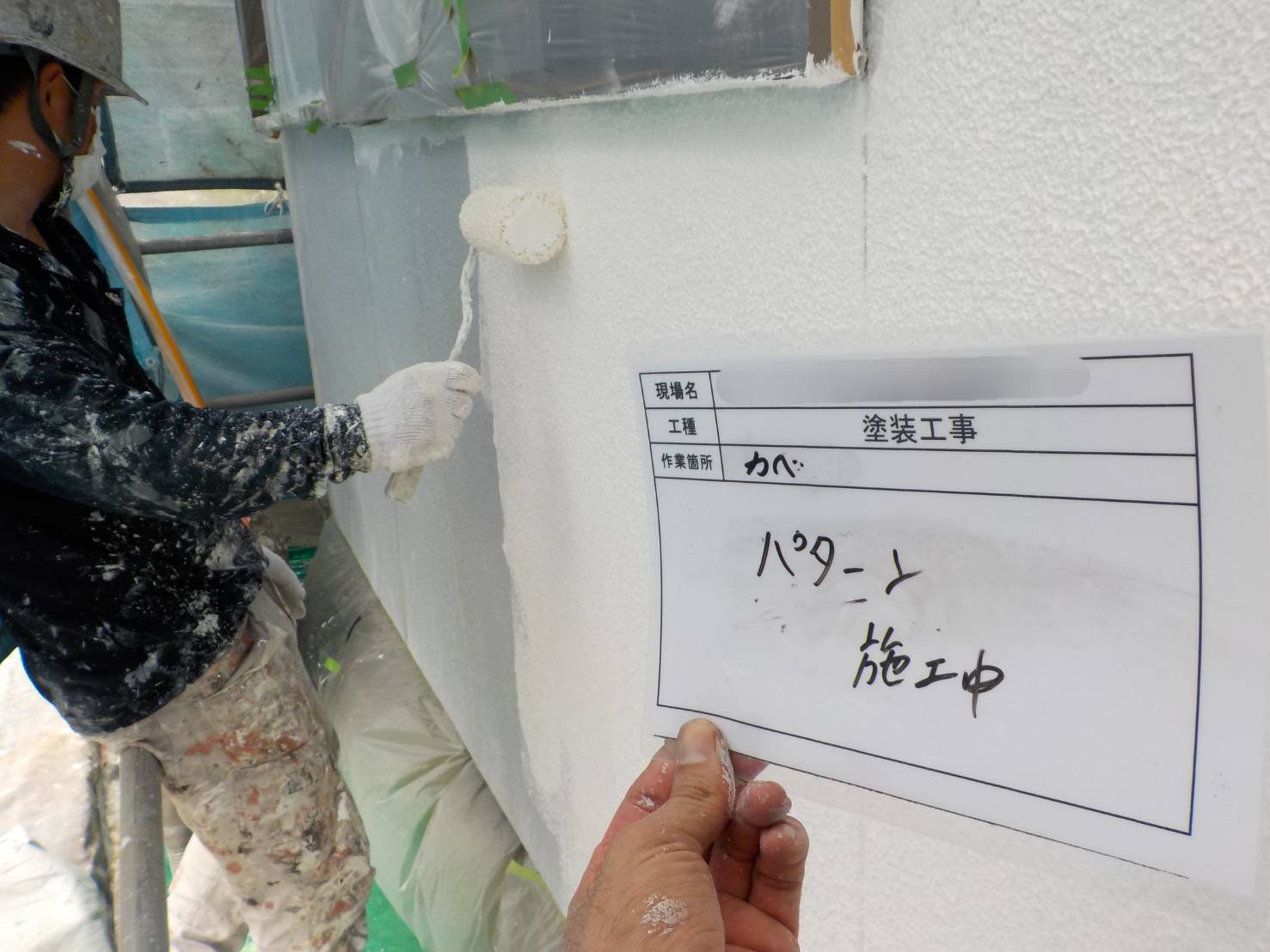 【外壁中塗り】今回は遮熱塗料の、フッ素REVO-IRで上塗り1回目です。塗布量と乾燥時間を厳守して塗っていきます