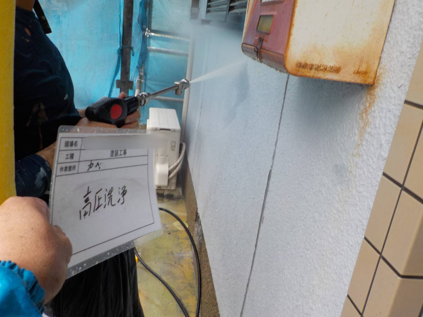 【外壁高圧洗浄】高圧洗浄にて苔・藻・カビ等の汚れや脆弱な塗膜を洗い落とします。