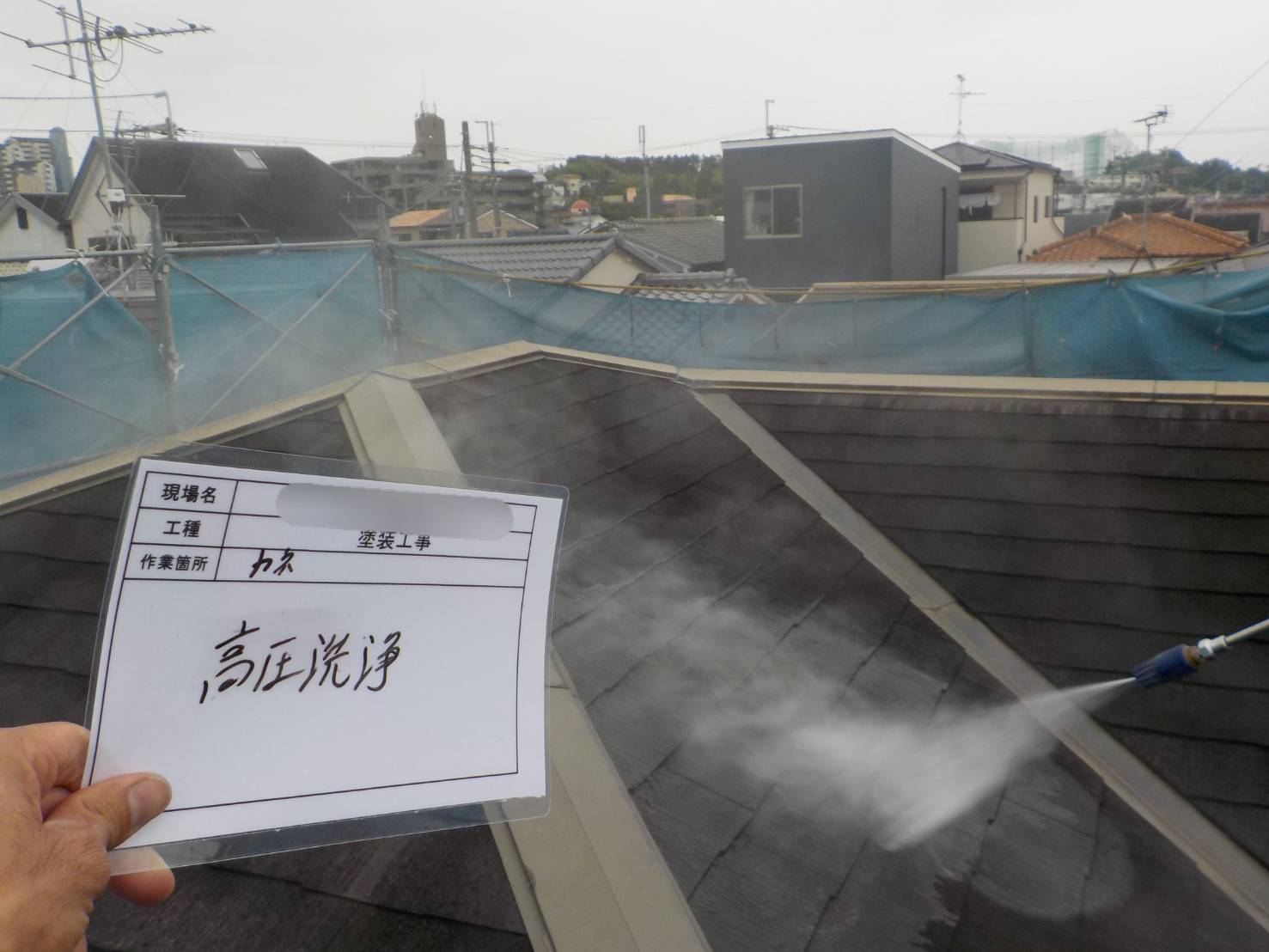 屋根高圧洗浄】高圧洗浄にて苔・藻・カビ等の汚れや脆弱な塗膜を洗い落とします。