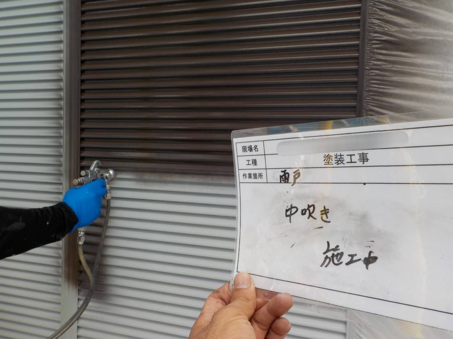 【雨戸戸袋、中吹き】今回はマックスシールド1500F-JYで中吹き1回目です。塗布量と乾燥時間を厳守して塗っていきます。