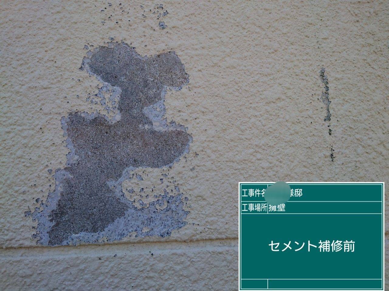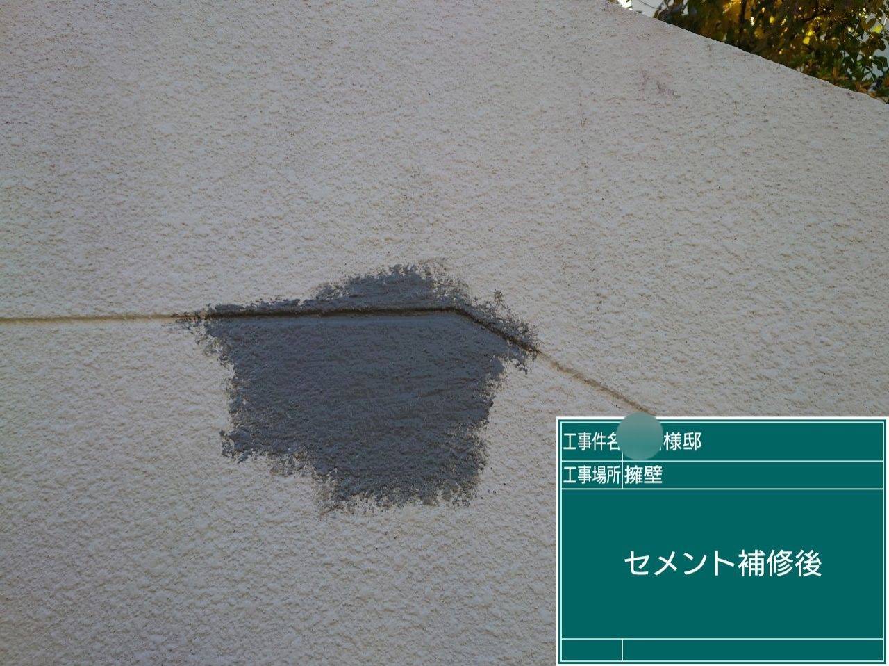 補修後 塗膜を取ると段差が出来るのでセメントの補修材で段差を無くし補修完成。