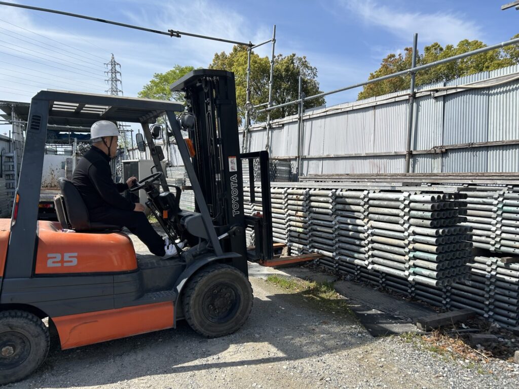 本来、日曜日は職人さんもお休みですが、今回は日曜出勤で足場の積み込み作業。急きょ私もリフトに乗り、柱や手すりのラックをトラックへ積み込みしてきました。